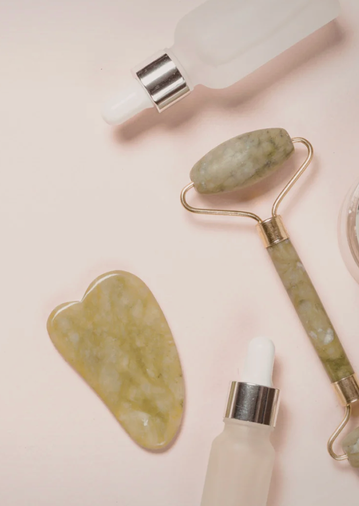 After cleansing and prepping the skin, your provider uses gua sha stones with slip (oil/serum) to glide along specific facial lines, promoting lymphatic drainage and microcirculation.